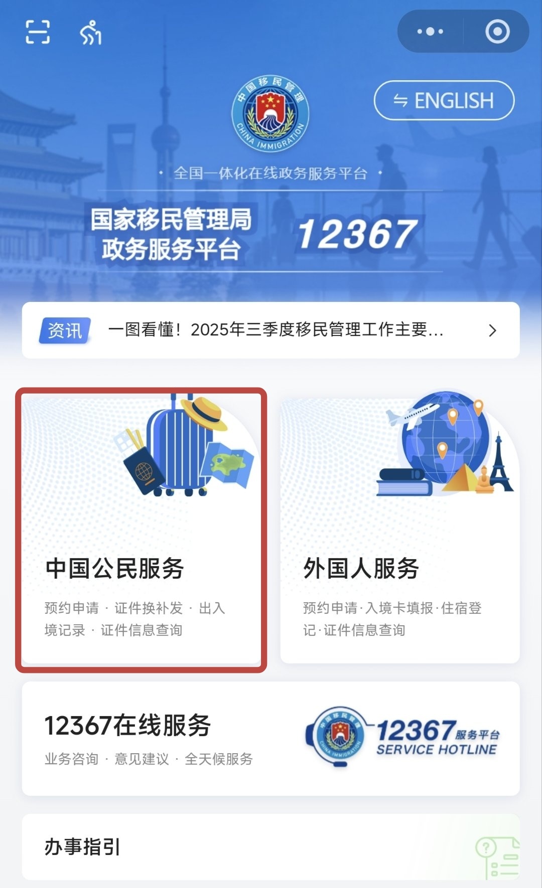 预约渠道有三个:打开wx或zfb,搜索“移民局12367”小程序;或者下载“移民局12367”App;又或者登录国家移民管理局政务服务平台。