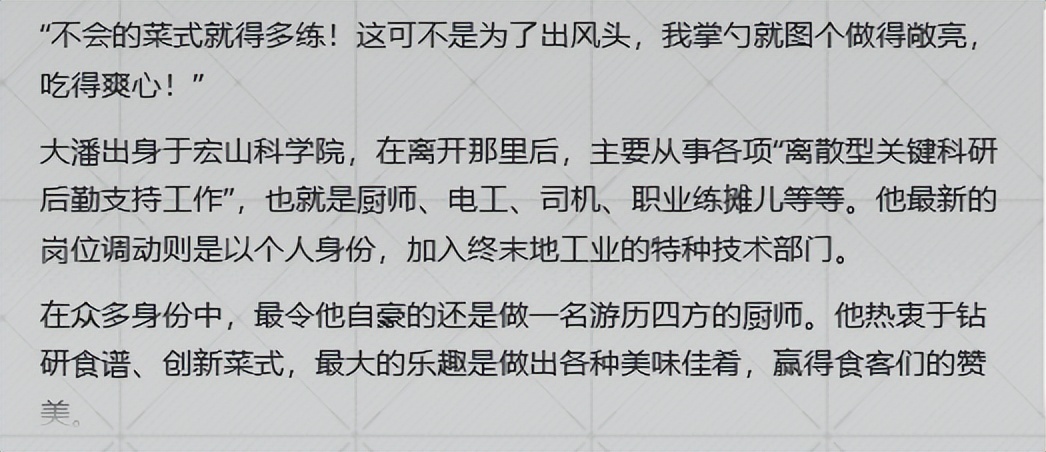 细致了解之后才发现其实资料里早就有写,人家可是个全才,除了红宏山科学院天师,还干过现在的厨子,电工,司机,最后进终末地也不是厨子身份而是技术工程师,再一研究这老资历的身份是真的兜不住了,大潘全名潘远,在那段搞科研的日子里还不到三十岁就已经拿下十二项学术成就,达成六项宏山科学院可持续发展目标,这拿下个天师职位真是当之无愧,甚至在武陵材料研究院三楼还能听到关于大潘十几年前的论文,在高手如云的宏山科学院,一篇论文能被研究十几年可见大潘的学术底力有多深厚。
