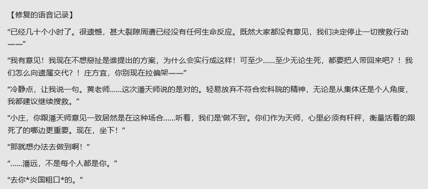 既然如此大潘是为什么转行成为一名厨子的呢?是十几年前那一场无人愿意提及的武陵科考站的悲剧,当时还是天师的大潘和庄方怡经历了甚大裂隙事故,那场事故吞噬了太多生命,也吞噬了大潘最在意的那个人,老天师们决定停止搜救,撞到了大潘愤怒的枪口上,最终这件事不欢而散,在老师的葬礼上,大潘静静的来又静静的离开,只是最后在祭奠中留下了老师最爱的辣酱,从此提交辞呈,离开了科研事业。