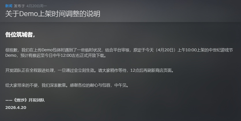 4 月 20 号中午 12 点:首版 Demo 已经上线了!现在打开 Steam 搜 “烽沙” 就能直接免费下载,不用等