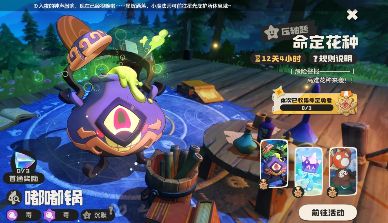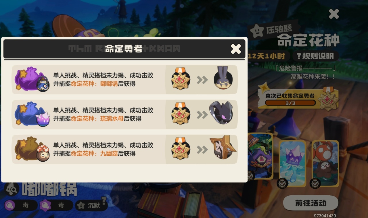 哈喽大家好我是小二!第三期命定花种昨天(4月24日)凌晨4点已经正式上线了!这次的三只BOSS分别是嘟嘟锅(沉默)、九幽菇(固执)、琉璃水母(沉默),都是60级的极品性格精灵,首通就能直接领,还能拿大量分光水晶和灵魂环印。