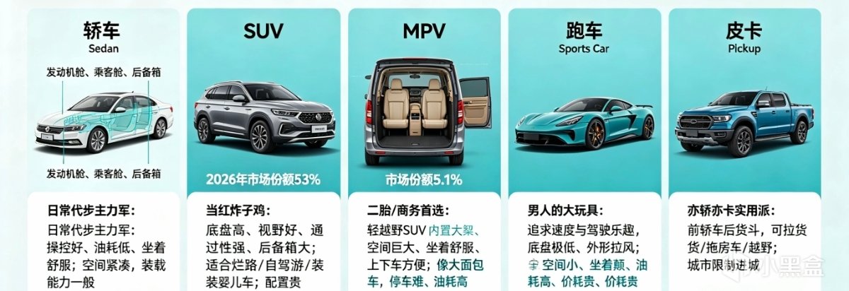 走在街上,各种车从你身边经过:高的、矮的、长的、短的、有屁股的、没屁股的。你完全分不清它们有什么区别,更不知道哪类车适合自己。什么轿车、SUV、MPV、轿跑……满屏名词,越看越晕。今天带你搞清楚:汽车到底分哪些类型?不同车有什么区别?