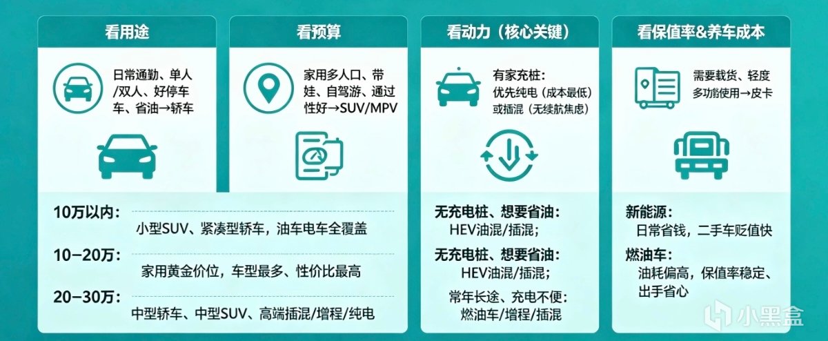 有固定车位能装充电桩 → 纯电(用车成本极低)或插混(没焦虑)。没充电桩、又想要低油耗 → 插混(当油车开也挺省)或日系油混。经常跑长途、充电不方便 → 插混、增程或传统燃油车。