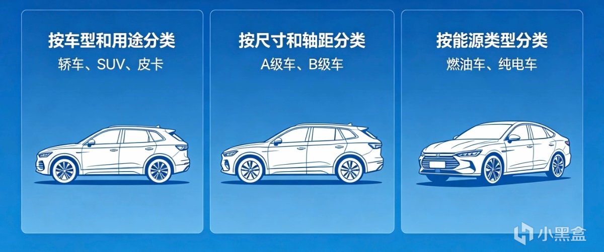 汽车分类有很多维度,你平时听到的那些名词——轿车、SUV、皮卡——是按车型和用途分的。但聊车的时候,大家还会聊“A级车、B级车”(这是按尺寸和轴距分的),以及“燃油车、纯电车”(这是按能源类型分的)。