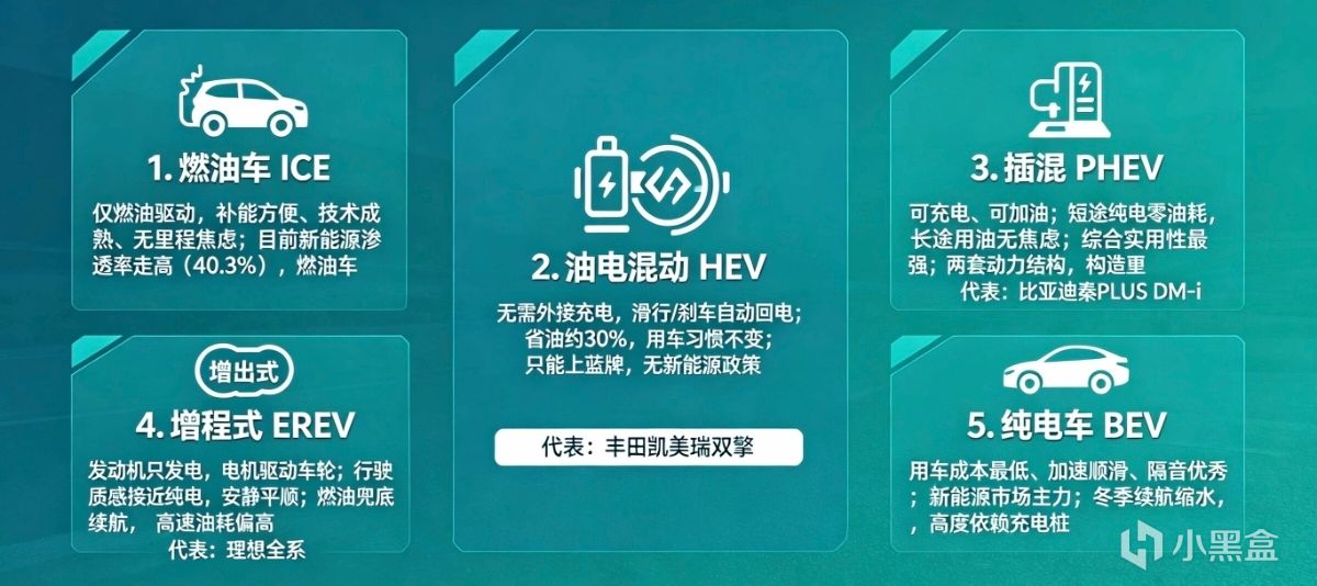 有充电桩短途当电车开,没电了当油车开。既能享受低用车成本,又彻底根治了里程焦虑,是目前最主流的新能源选择。缺点是有两套动力系统,部件多、结构复杂。