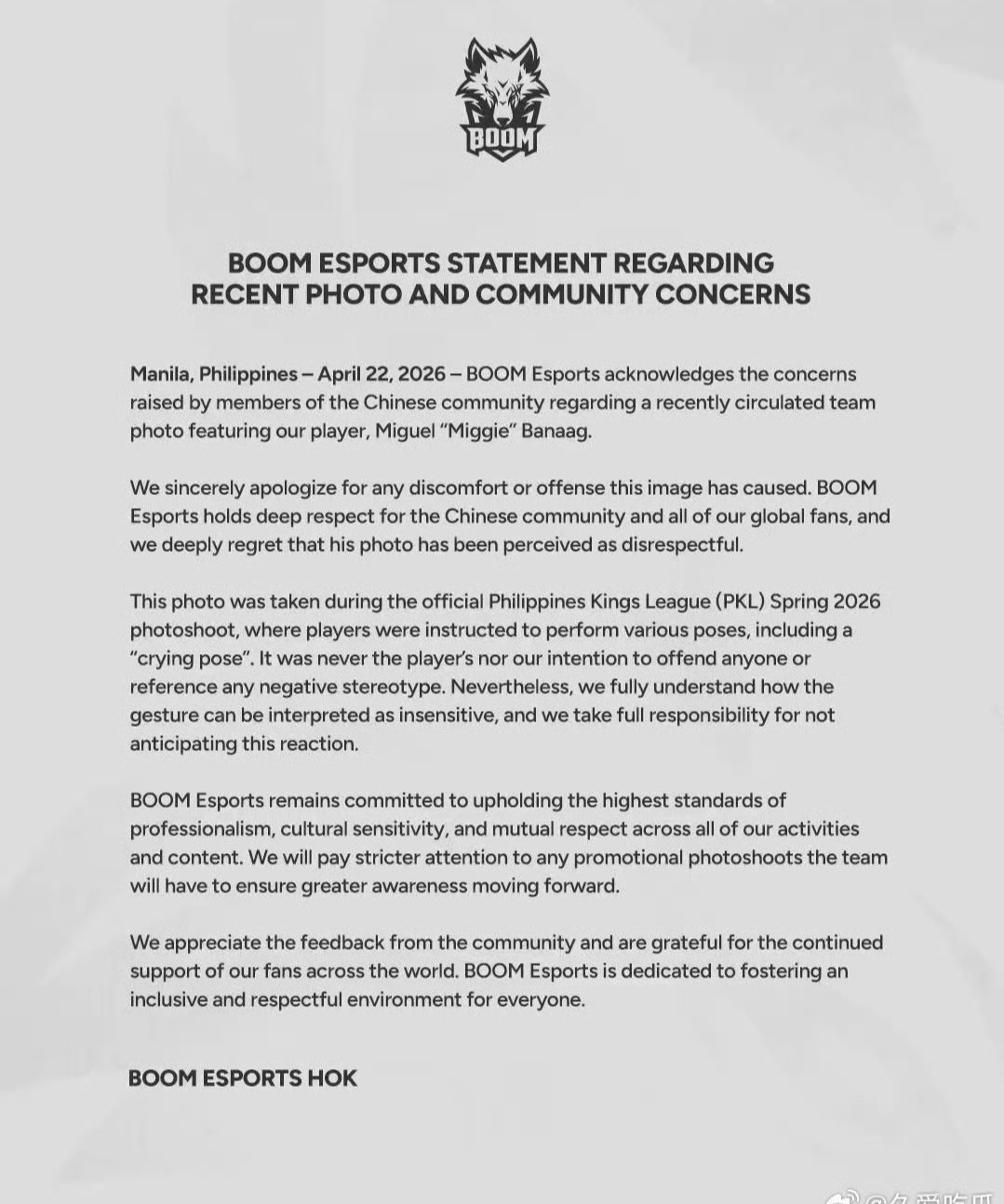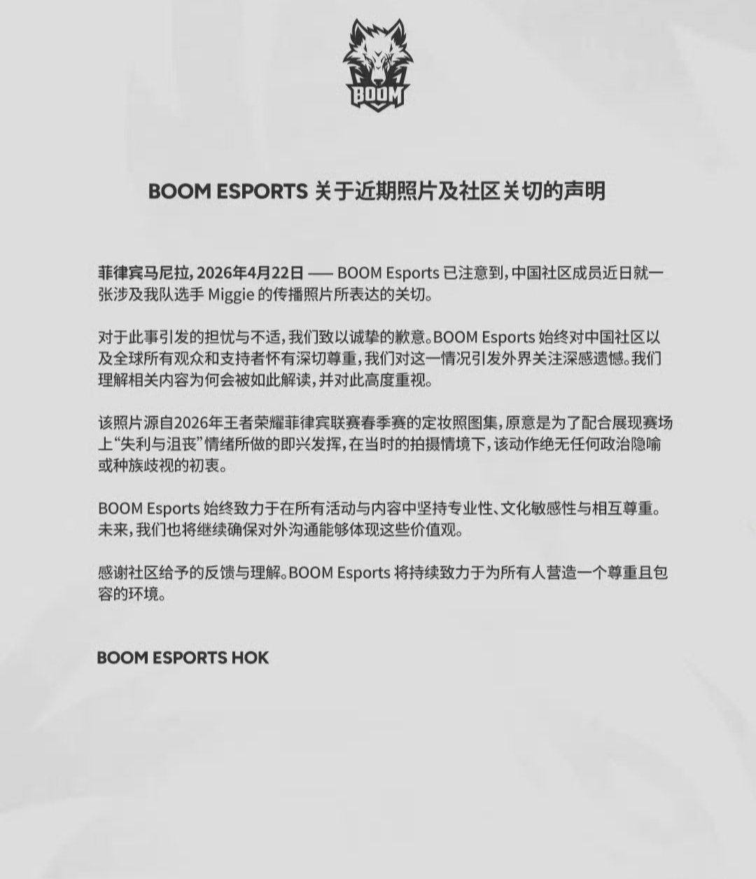 BOOM戰隊回應:戰隊官方同步發佈聲明,表示高度重視此事。強調尊重文化、尊重KPL賽事規範,並對宣傳物料中出現的問題承擔責任。戰隊也重申,Miggie的動作是無心之失,但會以此爲教訓,加強選手文化培訓。