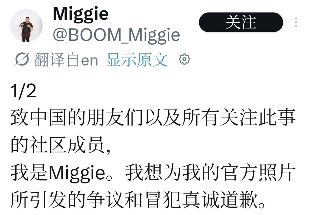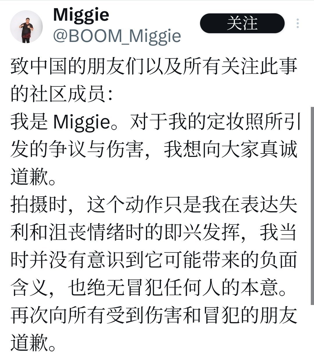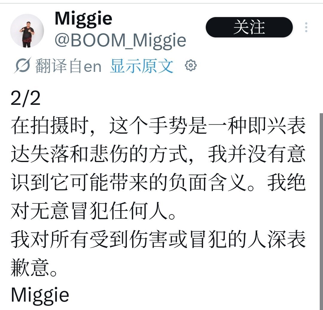 事件曝光後,Miggie通過海外社交平臺發佈雙語英文+中文致歉聲明。他解釋稱:該動作是即興的,目的是表達“失利後的沮喪情緒”或“哭泣難過”的感覺,並非針對任何羣體或帶有主觀冒犯意圖。他誠懇向“所有因此感到不適的觀衆道歉,承認自己對文化差異的敏感性認識不足。