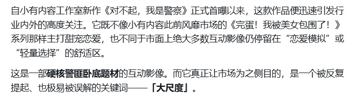 试玩版能玩到的内容比较有限,那我再顺带跟大家聊聊这款游戏背后制作组的创作故事。 其实这款游戏在四月份就发过一篇宣发文章,标题挺抓人眼球的——《对不起,我是警察》以大尺度重塑互动影像边界。当时我就特别好奇,互动影游到底要怎么拿捏这种题材,才能真正做到突破以往的风格呢?