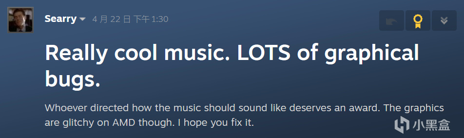 【标题】:音乐真棒但游戏图形bug很多【内容】:负责游戏音乐设计的人真得给他颁个奖,不过游戏在AMD显卡上图形确实有故障,希望你们能修复。