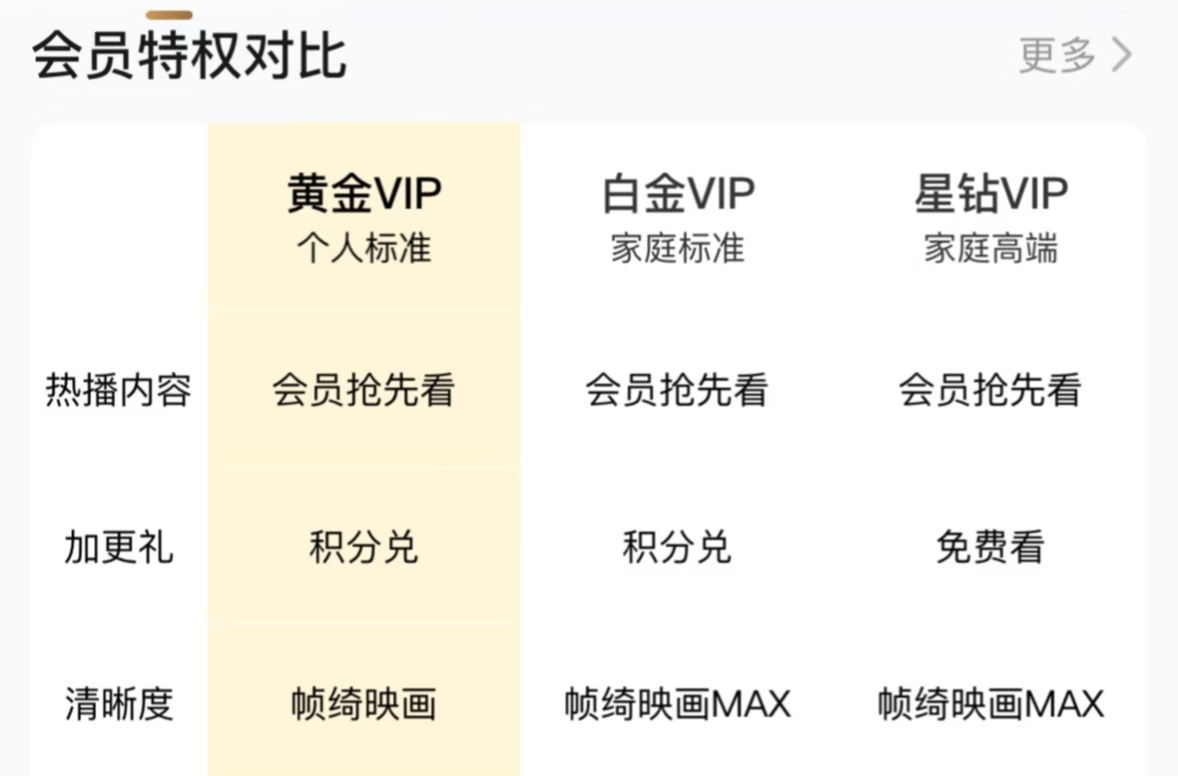 2.2023年初,爱奇艺以"优化服务"之名,悄悄将黄金VIP会员的投屏清晰度从此前的4K断崖式下砍至480P。用户若想要更高清晰度,必须另行购买更高级别的白金或星钻会员。