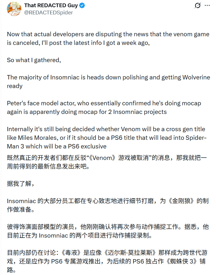 最近几周陷入矛盾报道的《毒液》项目,据称仍在内部讨论中。该消息表明,失眠组尚未最终确定该项目是像《迈尔斯·莫拉莱斯》那样发布为跨世代游戏,还是转向直接衔接《漫威蜘蛛侠3》的PS6独占发布。正如帖子中所描述的:“内部仍在决定《毒液》是像《迈尔斯·莫拉莱斯》那样的跨世代作品,还是应成为一部PS6独占作品,为同样是PS6独占的《蜘蛛侠3》做铺垫。”