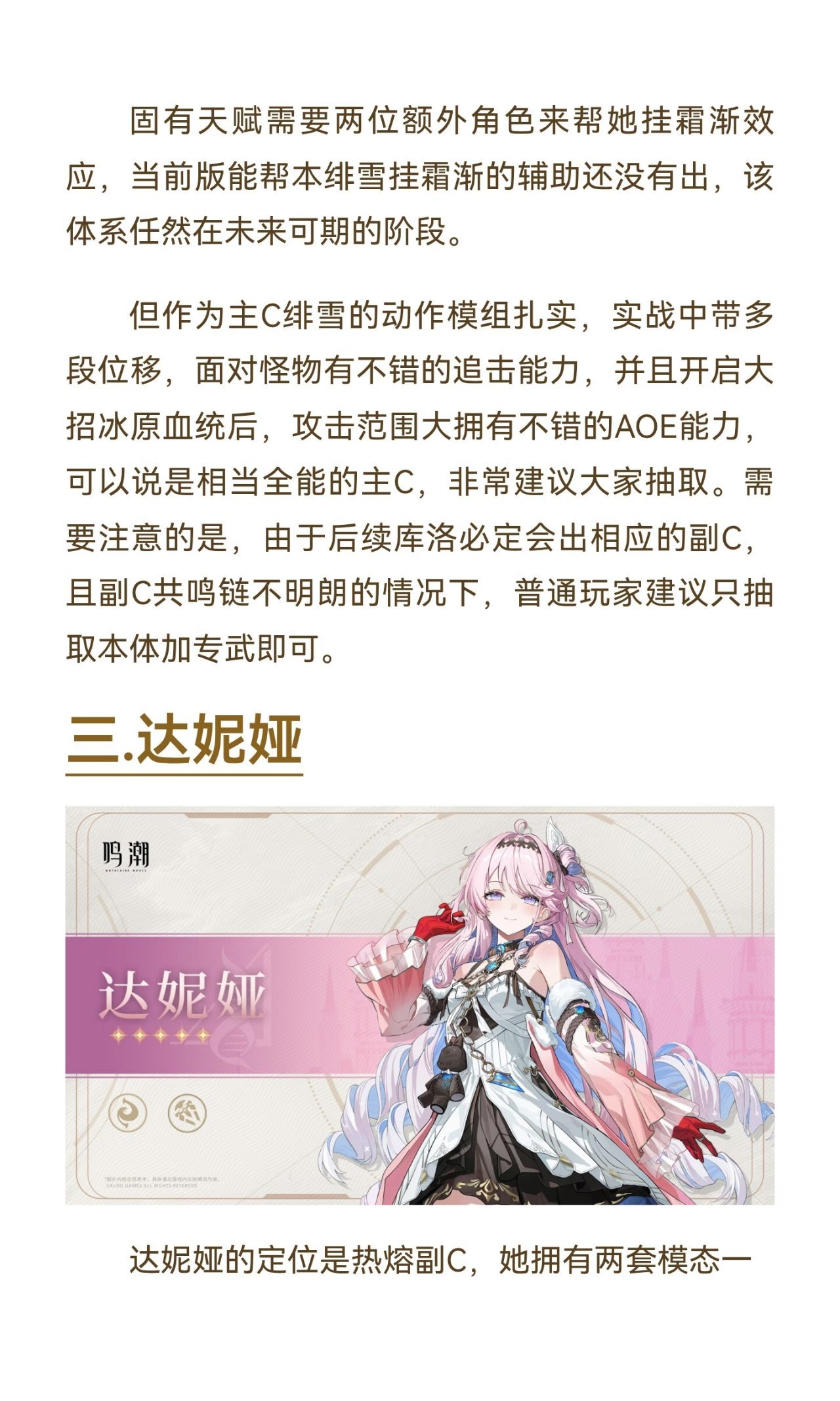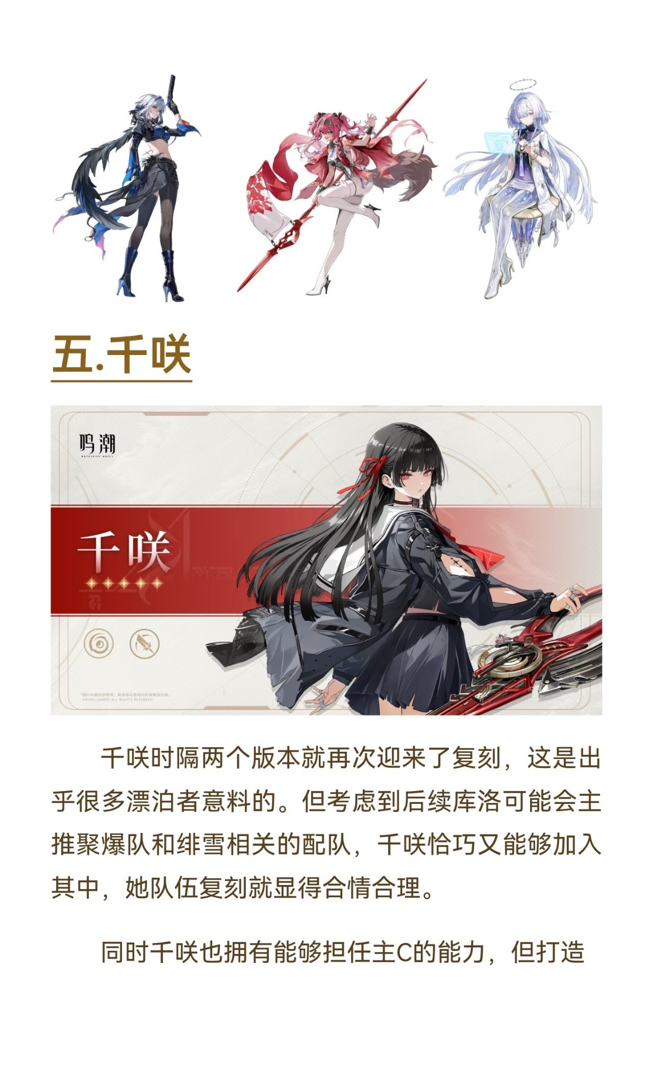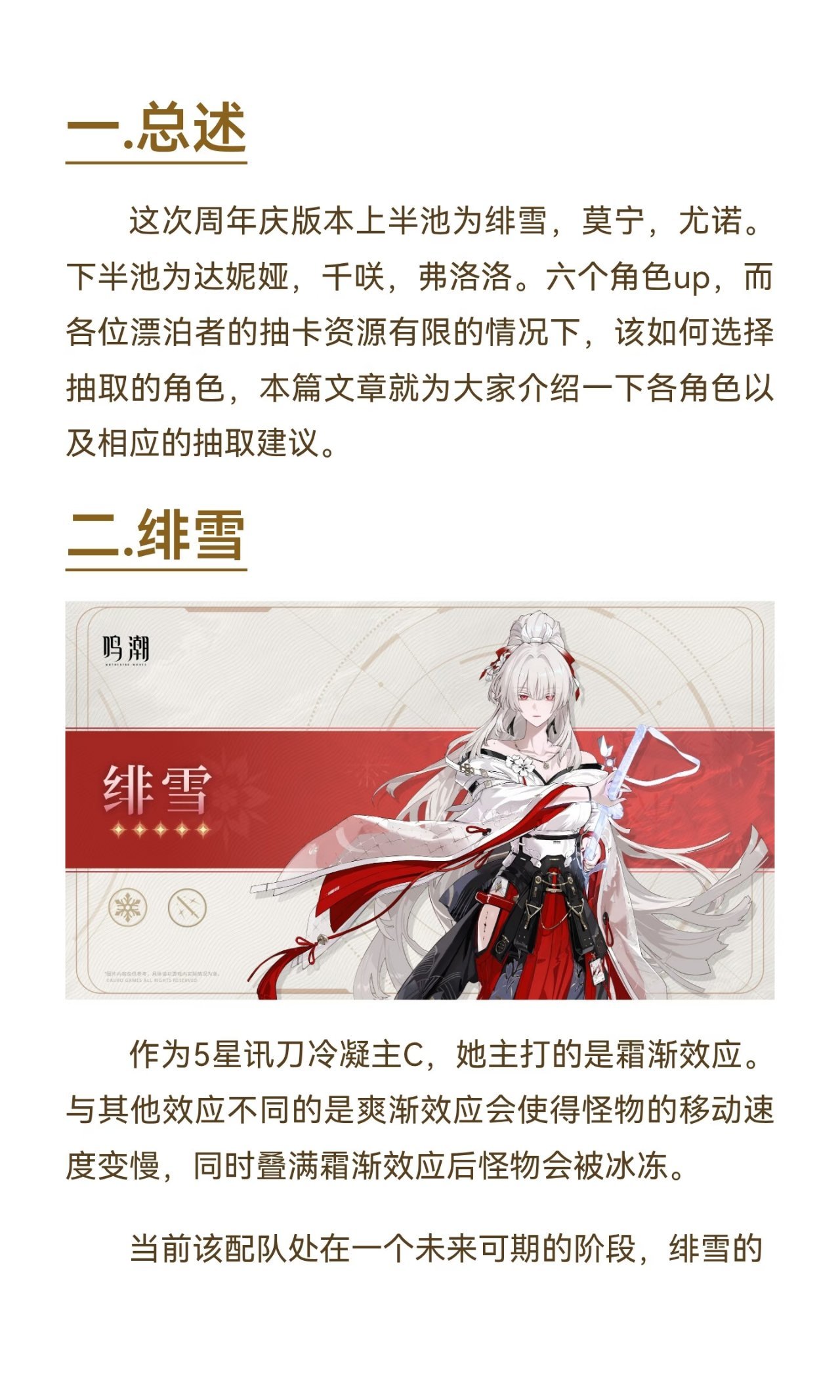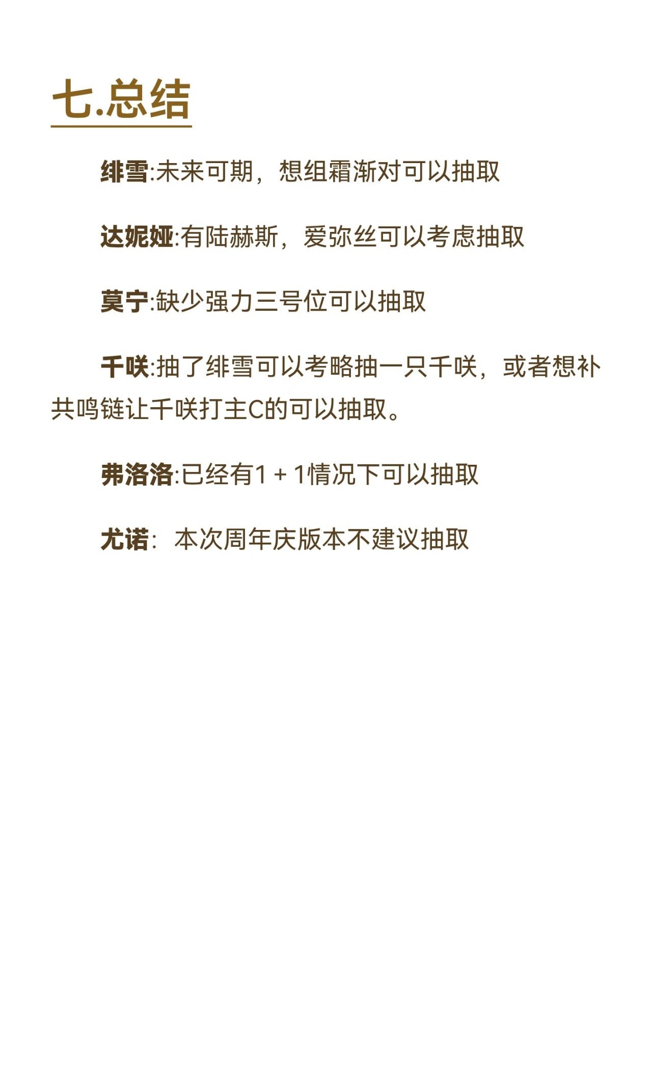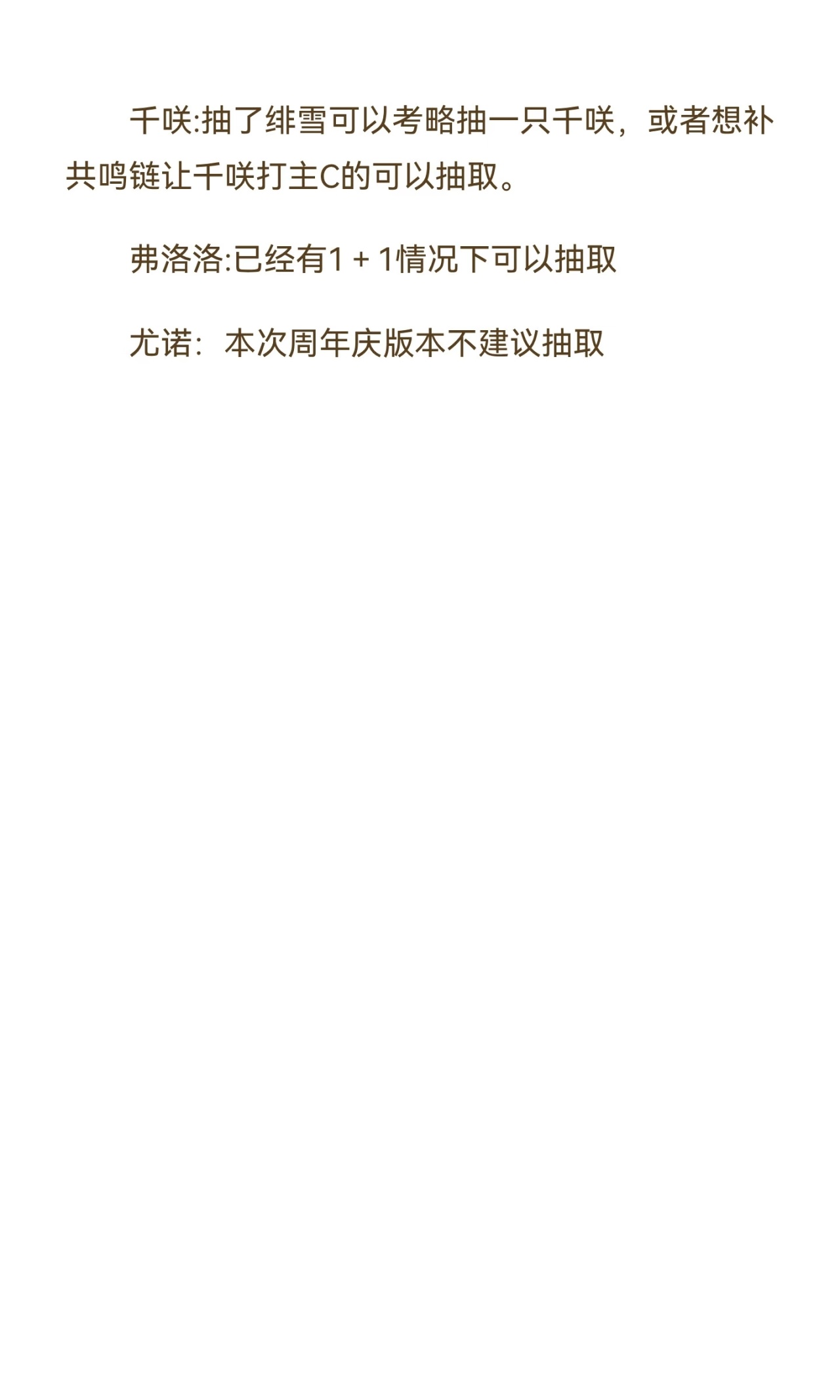 周年庆版本上半池绯雪、莫宁、尤诺,下半池达妮娅、千咲、弗洛洛。绯雪未来可期,达妮娅适合陆赫斯,莫宁就业广阔,千咲复刻效应队可考虑,弗洛洛已有共鸣链可抽,尤诺无日月队不建议抽取。
