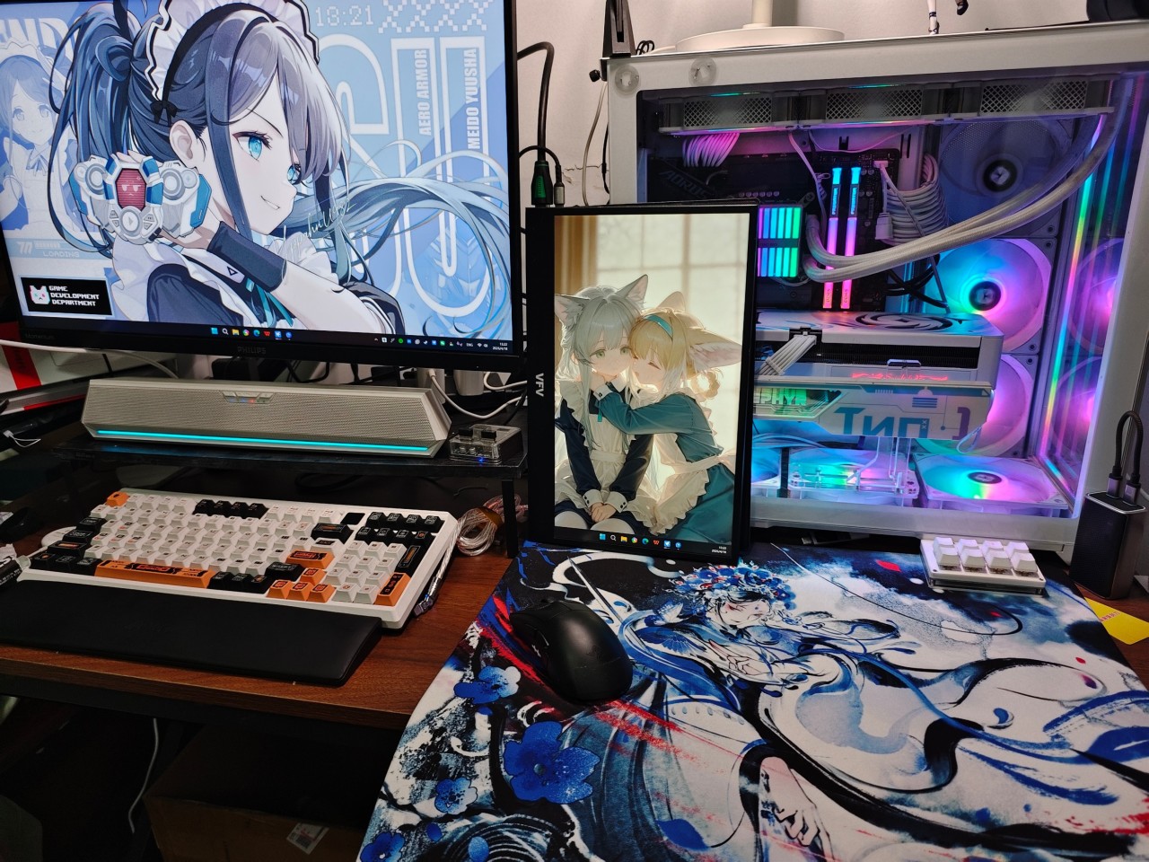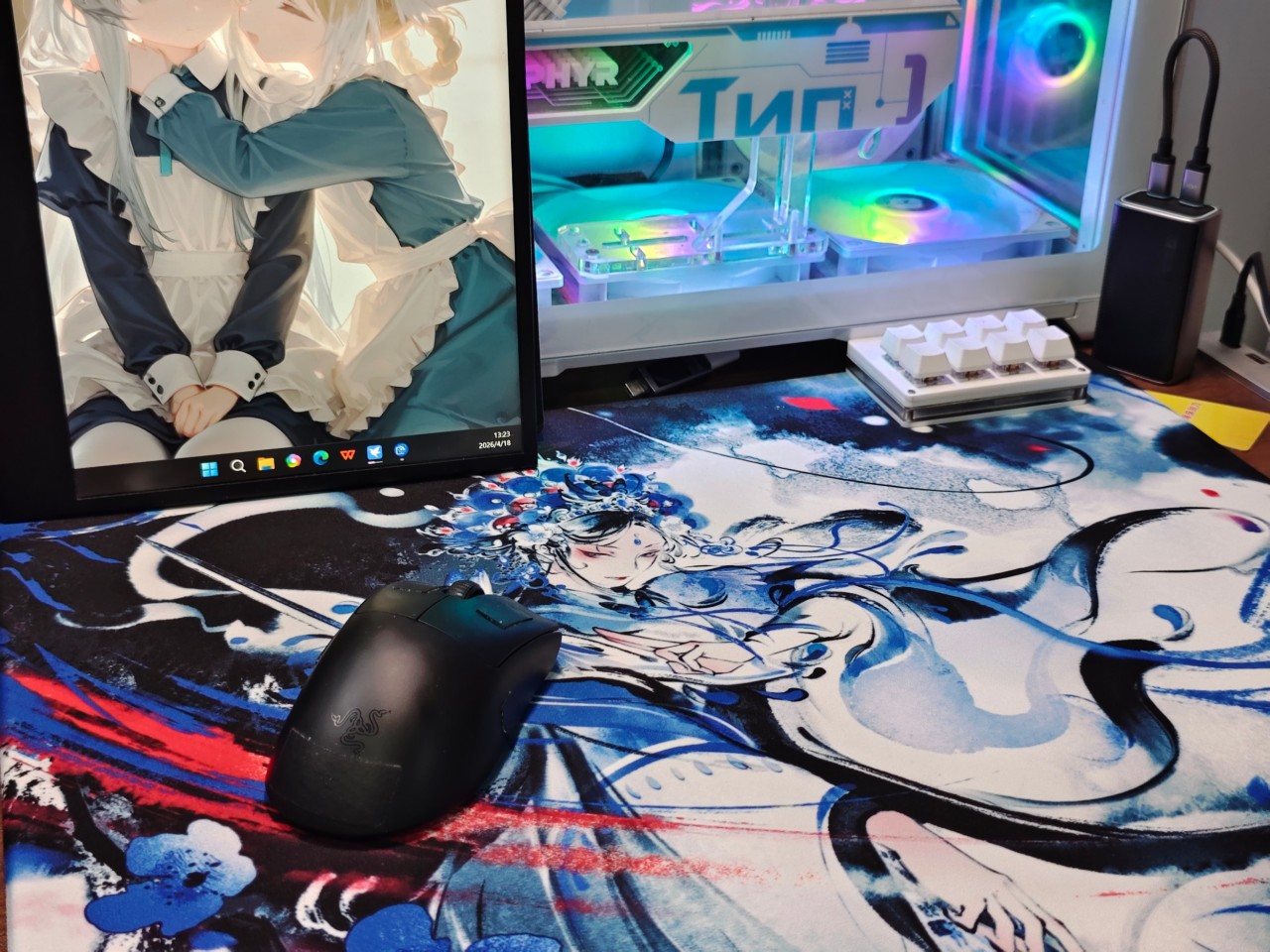 這個尺寸對於我這種小桌面來說不完全契合,但是依然能放在上面,可以覆蓋住大部分。並且他這個亂紋稍微有一點粗糙感,建議帶冰袖,沒有冰袖的話會有點磨手。