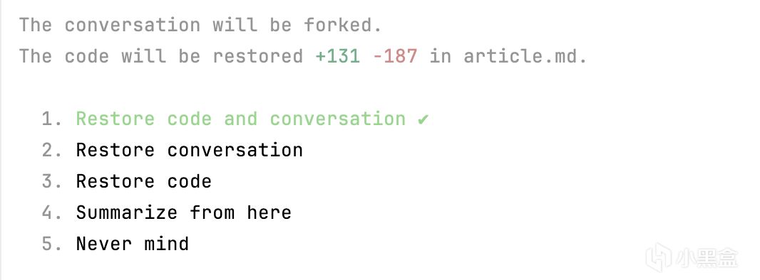 这个命令可能是最被低估的一个,因为这个命令刚刚拯救了这篇文章。我花了一下午将这篇文章修改到了这里,然后被AI回滚了。