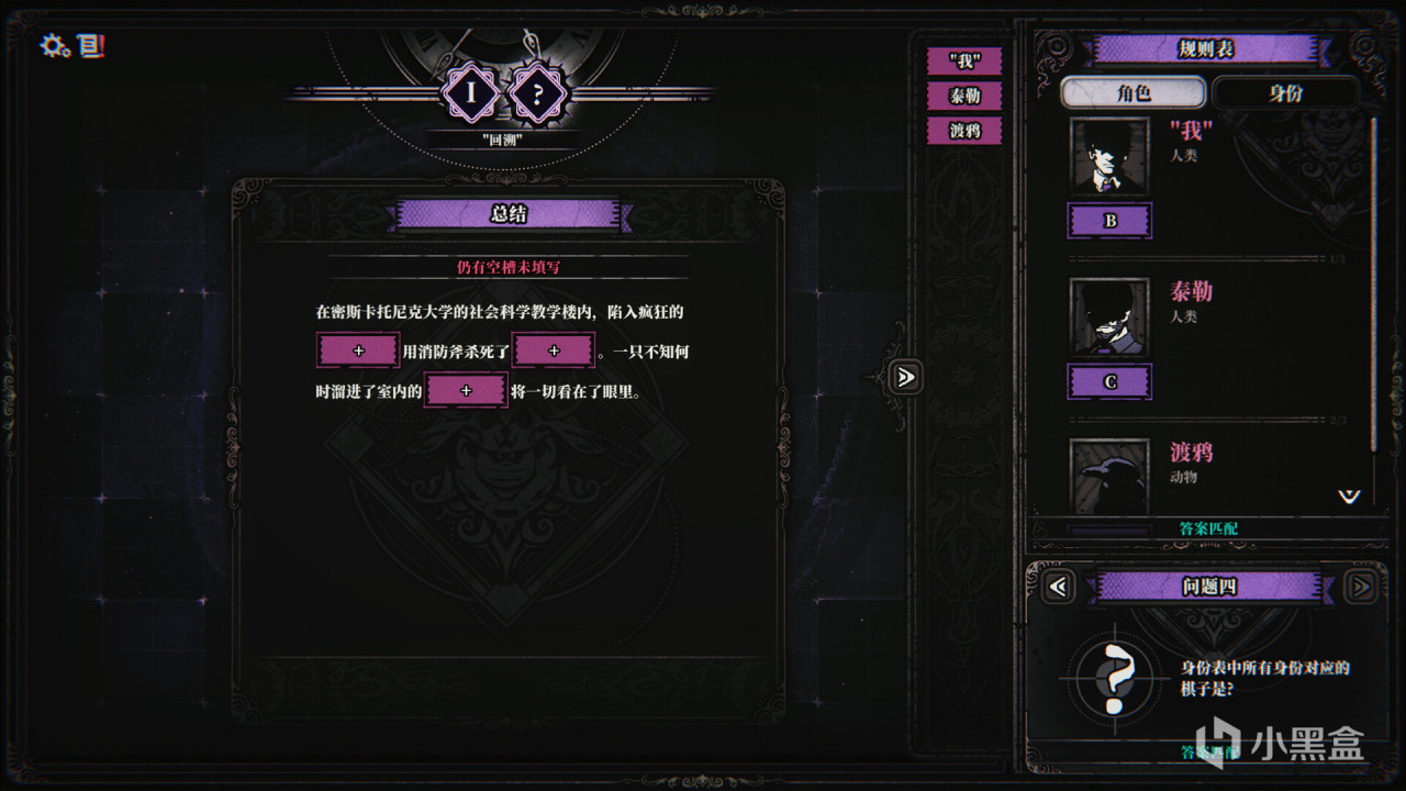本作中会有多条时间线变动,玩家需要根据不同时间线的线索进行推理,确认场景地点、角色身份和行为,一点点还原整个事件的始末。