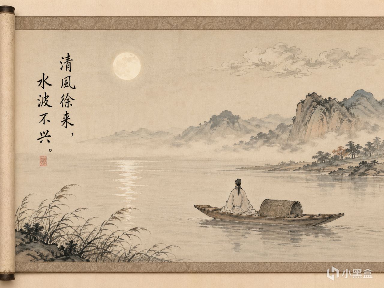 6. 画面包含:【山水/江月/楼阁/人物/舟船/云雾】等元素;