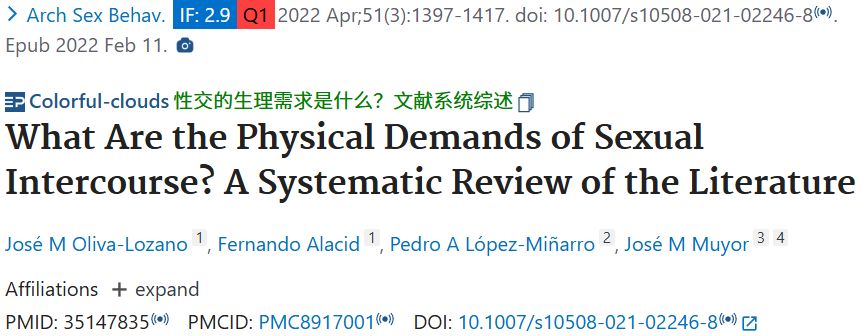 文献3:Oliva-Lozano JM, Alacid F, López-Miñarro PA, Muyor JM. What Are the Physical Demands of Sexual Intercourse? A Systematic Review of the Literature. Arch Sex Behav. 2022 Apr;51(3):1397-1417. doi: 10.1007/s10508-021-02246-8 . Epub 2022 Feb 11. PMID: 35147835; PMCID: PMC8917001.