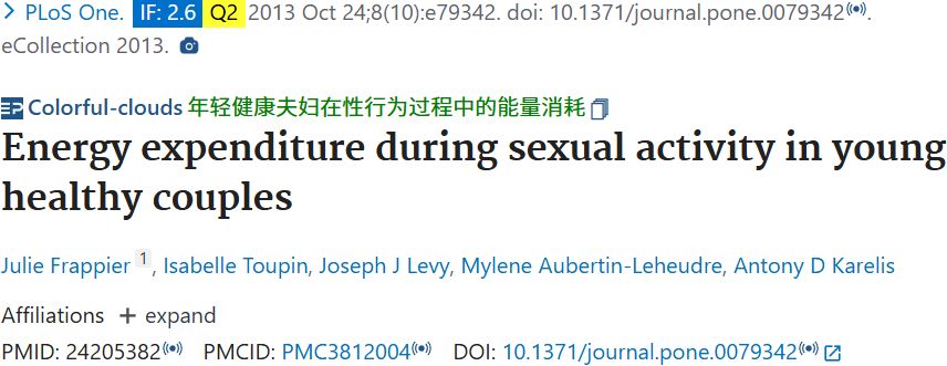 文献4:Frappier J, Toupin I, Levy JJ, Aubertin-Leheudre M, Karelis AD. Energy expenditure during sexual activity in young healthy couples. PLoS One. 2013 Oct 24;8(10):e79342. doi: 10.1371/journal.pone.0079342 . PMID: 24205382; PMCID: PMC3812004.