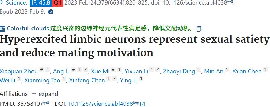 文献1:Zhou X, Li A, Mi X, Li Y, Ding Z, An M, Chen Y, Li W, Tao X, Chen X, Li Y. Hyperexcited limbic neurons represent sexual satiety and reduce mating motivation. Science. 2023 Feb 24;379(6634):820-825. doi: 10.1126/science.abl4038 . Epub 2023 Feb 9. PMID: 36758107 .