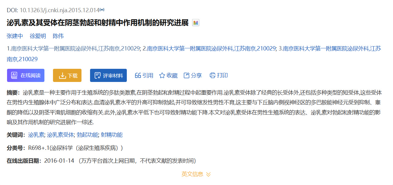 文献2:张建中,徐爱明,陈伟. 泌乳素及其受体在阴茎勃起和射精中作用机制的研究进展[J]. 中华男科学杂志,2015,21(12):1125-1128. DOI:10.13263/j.cnki.nja.2015.12.014 .