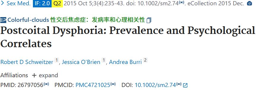 文献5:Schweitzer RD, O'Brien J, Burri A. Postcoital Dysphoria: Prevalence and Psychological Correlates. Sex Med. 2015 Oct 5;3(4):235-43. doi: 10.1002/sm2.74 . PMID: 26797056; PMCID: PMC4721025.