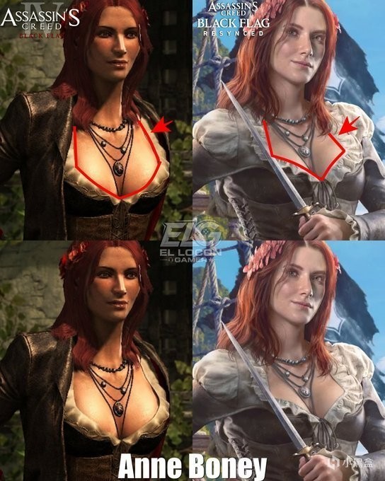 争议的核心在于重制版安妮·伯尼的形象设计。玩家制作的原版与重制版对比图显示,重制版安妮的胸部明显小于原版,且服装更加保守。有玩家甚至量化表示,新形象的胸部"被严重削弱了35%"。