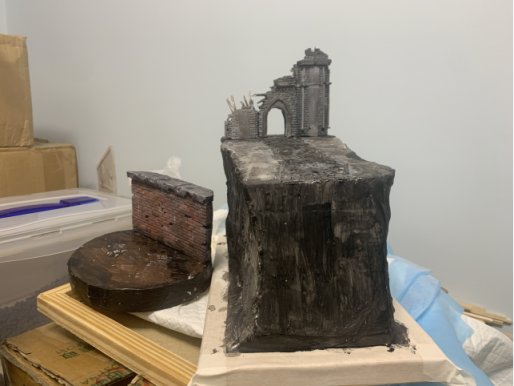 此步驟用深色對模型上個底色,目的是遮蓋住原本膩子的白色和擠塑板的藍色,讓模型顏色統一,往後在添加其他顏色,採用的順序是由深到淺,由暗到亮。