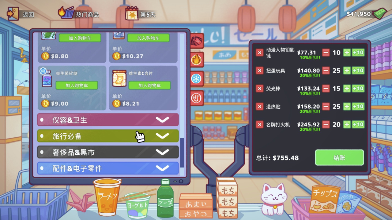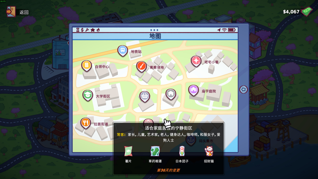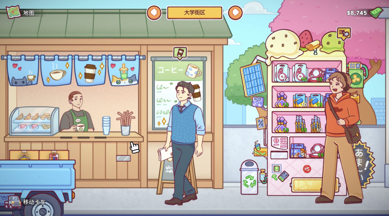 因此,玩家需要摸清各个区域人们的需求,商业区的白领们要咖啡、观光区的游客们要零食、二次元街区的阿宅们要手办和扭蛋···只要应他人之所需,躺在家里听钞票唰唰进账指日可待。
