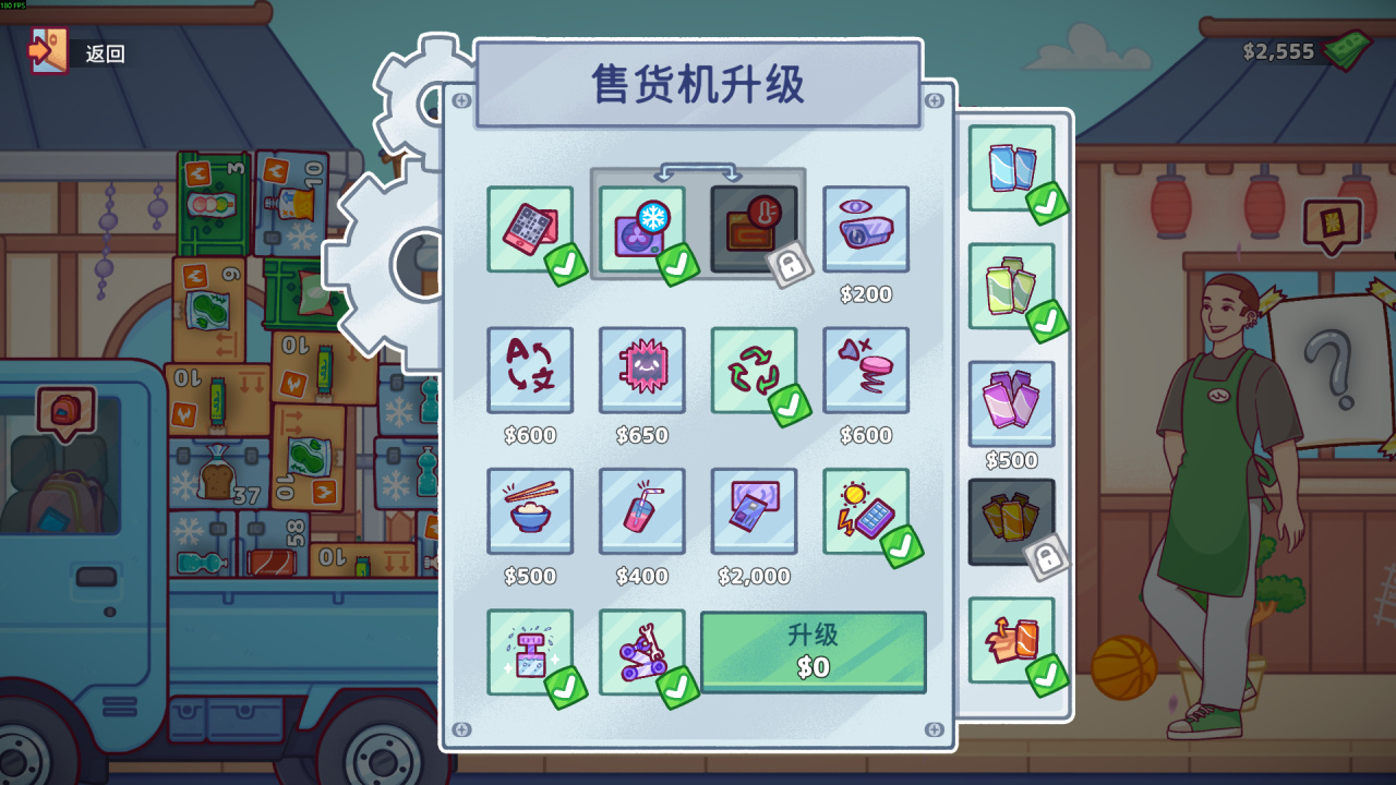 为了能彻底从杂务中脱身出来,成为一个甩手掌柜,就需要玩家对售货机进行升级,完成一定程度上的自动化。既有系统功能方面的升级,譬如二维码收费、自动补货,亦有通过张贴广告等方式,提升销量的提升。进而,玩家赚得更多,也更轻松。