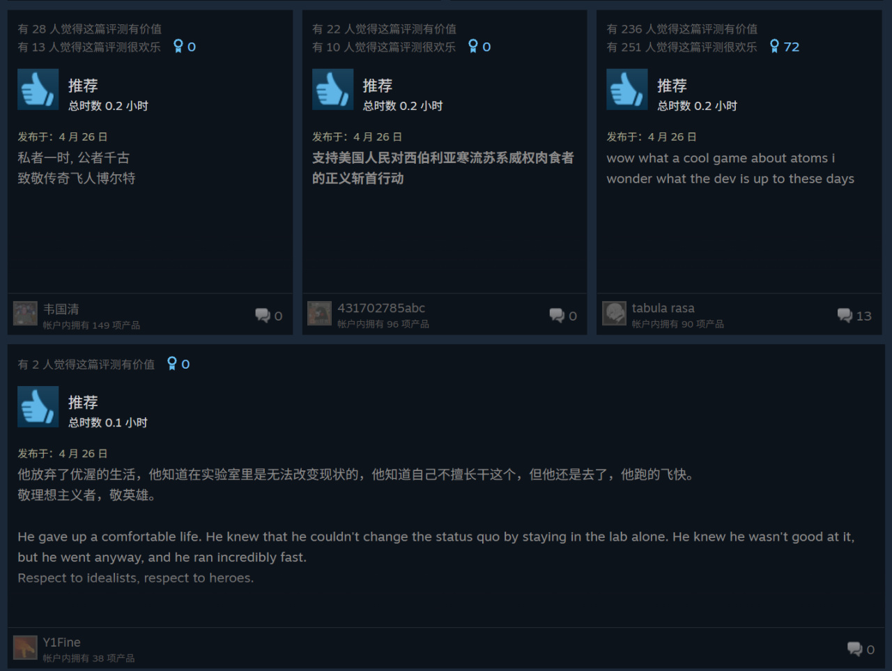 《Bohrdom》本身是个原子、电子、物理主题小游戏,所以有人拿“electron / photon / physics / Maxwell’s Demon”等词硬拗现实事件。笑点在于用很书呆子的物理术语包装暴力新闻。