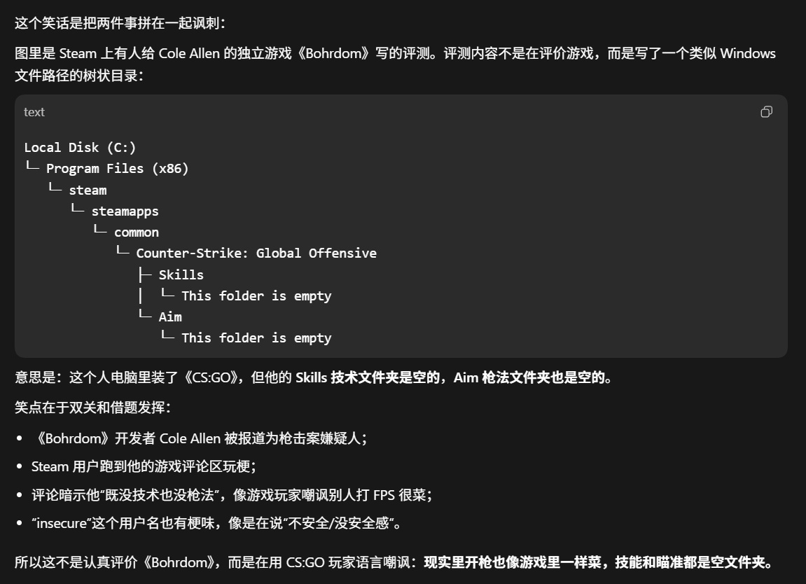《Bohrdom》不是射击游戏,但评论区反复说 “good shooter / bad shooter / missed shots”。笑点是把“游戏类型里的 shooter”和“现实枪击嫌疑人”混在一起。你截图里那个 CSGO 文件夹梗也属于这一类:Skills 和 Aim 文件夹为空,意思是“没技术、没枪法”。