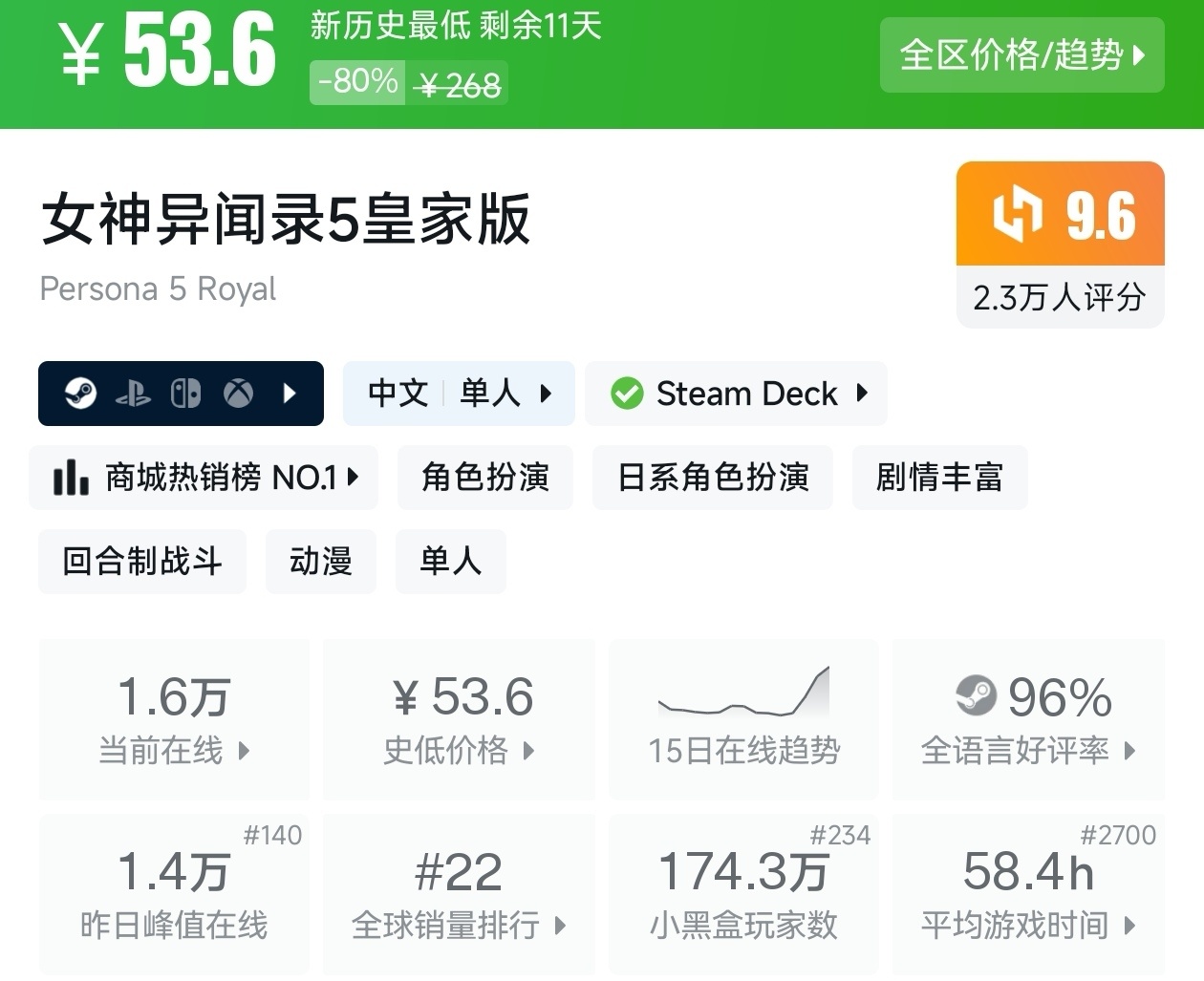 大家好,没错,又是我,你们的老朋友亦然,在最近,就是日厂黄金周,有很多游戏都在打折,尤其一些日厂的游戏,包括很多大作,其中就有很多游戏迎来了新史低,其实新史低的游戏买起来最有安全感,因为在很长一段时间都不会更低,我将为各位进行一个汇总,希望我的汇总,能够帮助各位盒友挑选心仪的游戏。
