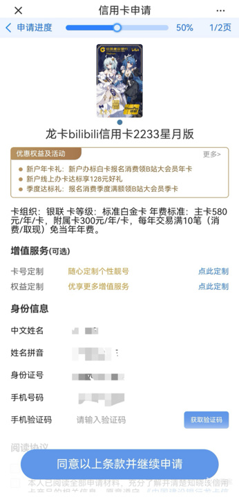 我这是龙卡B站信用卡2233星月学生版,有对应的非学生卡。是25年3月办这张卡,因为我之前是自己很便宜买了一年,额应该是吧,不便宜我应该都不会买b站,要啥没啥。后面发现有次刷B站看到联名卡然后附带活动免费领取,后面就是白嫖之旅。下面就对申请流程和如何领取进行一个简单讲解。
