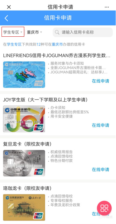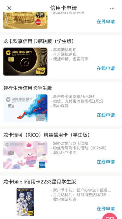 在左上角选择学生分区,拉到最底下就有这张卡,如果不是学生,就可以直接检索b。点进去就可以开始申请啦。这里需要注意的是学生版没有信用卡额度,所以是需要你要有张建设银行卡往里面赚钱滴;非学生版,是有年费,需要一年满10笔消费才免年卡,这个要求还行。