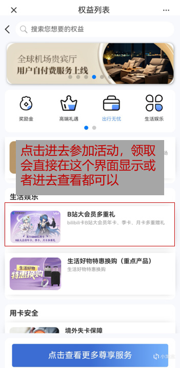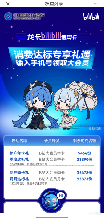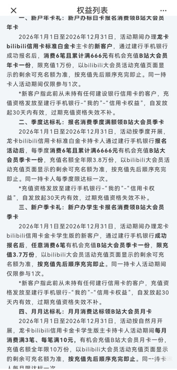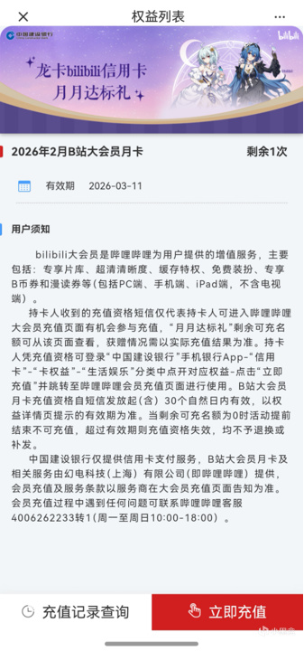建行app-信用卡-对应卡的权益/点对应卡里面我的权益-选择B站活动-参加活动