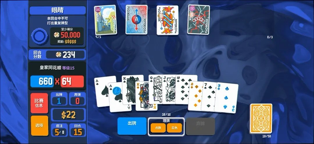 再比如,如果你根本摸不出同花顺,那么用顺子过渡甚至放弃同花顺是更好的选择。这时候改花色、删牌、加弃牌次数、增强过牌能力,虽然不直接加分,但它们提高了“打出同花顺的概率”。