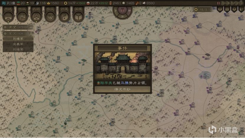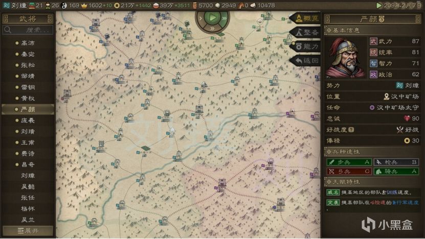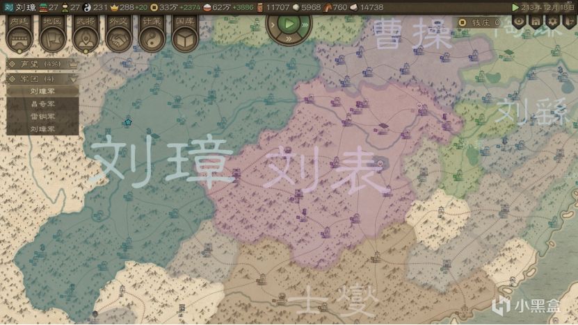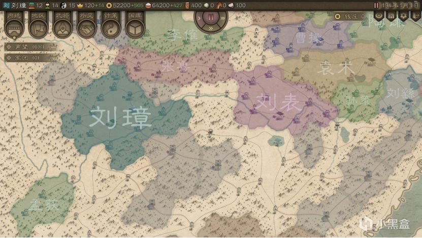 为啥推荐刘璋开局呢?这小子环境是真的好。从地图来看,向北只有被马腾和李傕虎视眈眈盯着的张鲁和一个蛮夷部族,往南是有一定距离的孟获部族和蛮夷,西部没有敌人,东部也和刘表保持着一定距离,可以说完全没有生存压力。