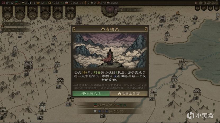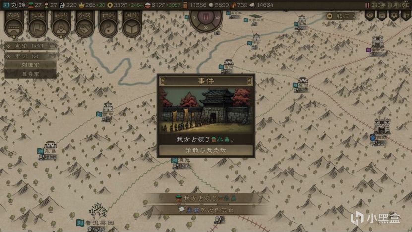 游戏并没有一个特定的主线剧情强制游玩,而是提供了诸多时间节点以供选择,自由选择一个时间节点和其中的一个势力进行扮演。最后一个英雄集结则是原创的虚构结局。游戏的难度也分两个选择:一个是选择AI势力的强度和是否开启自然灾害,另一个则是对自身扮演势力的选择。选择群雄割据开局时,系统会提醒没有游玩记录的玩家选马腾和刘璋进行游玩。第一次装B选刘备开局两下被人打得找不着北,这次就选刘璋开局吧。