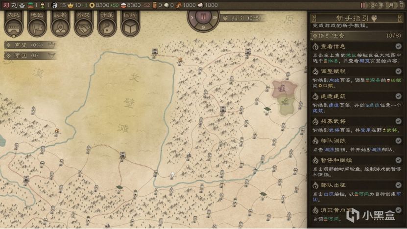 游戏的新手教程将时间设定黄巾起义的时间,由玩家操控刘备方去平定附近黄巾之乱。操作上,简要介绍了地区、内政、武将以及出征几个板块,以刘备出军消灭河间黄巾军,占领河间为结束。