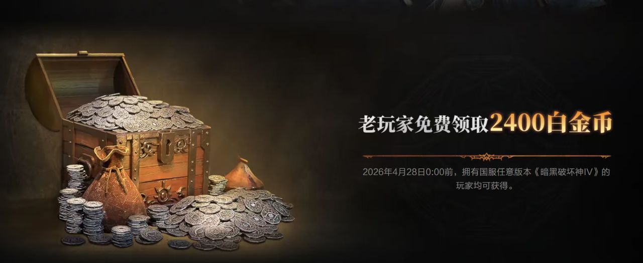 A:老玩家需要在2026年4月28日-5月27日期间,前往活动页面领取(https://d4.blizzard.cn/h5/20260428/flhd/)。白金币领取后会在2个工作日内到账。