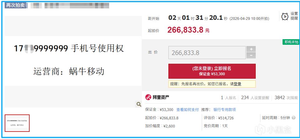 早在 2 月 26 日,这个号码就曾挂网拍卖,当时评估价和起拍价都是 51.4726 万元,保证金高达 10.29 万元。但整场拍卖下来,没人出价,最后流拍。