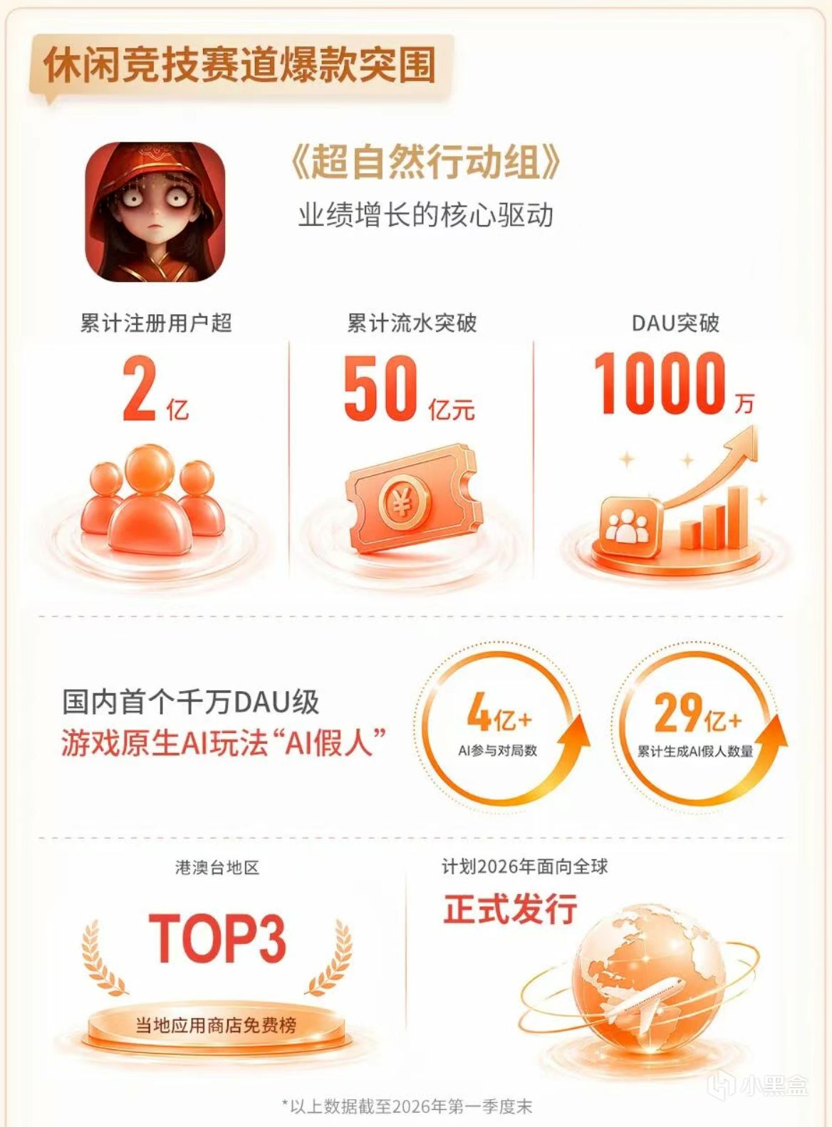 从数据来看,《超自然行动组》长期位列iOS免费榜TOP10,畅销榜最高达到第4名,DAU突破1000万,进入千万级日活产品行列。截至2026年第一季度末,累计注册用户超过2亿,累计流水突破50亿元。
