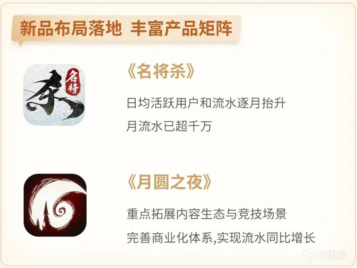 《月圆之夜》通过扩展内容生态、完善竞技玩法和商业化体系,实现流水同比增长;在研卡牌游戏《名将杀》于2025年12月开启不删档付费测试,并于2026年3月登陆Steam平台,获得玩家较好的反馈。截至年报披露时,其月流水已突破千万,计划于2026年暑期档正式上线推广。