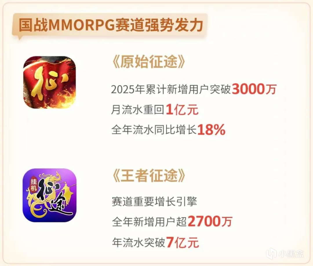 具体来看,《原始征途》小程序版本全年新增用户超过3000万,月流水回升至1亿元,全年流水同比增长18%;《王者征途》全年新增用户超过2700万,年流水突破7亿元,逐步成长为新的增长点。