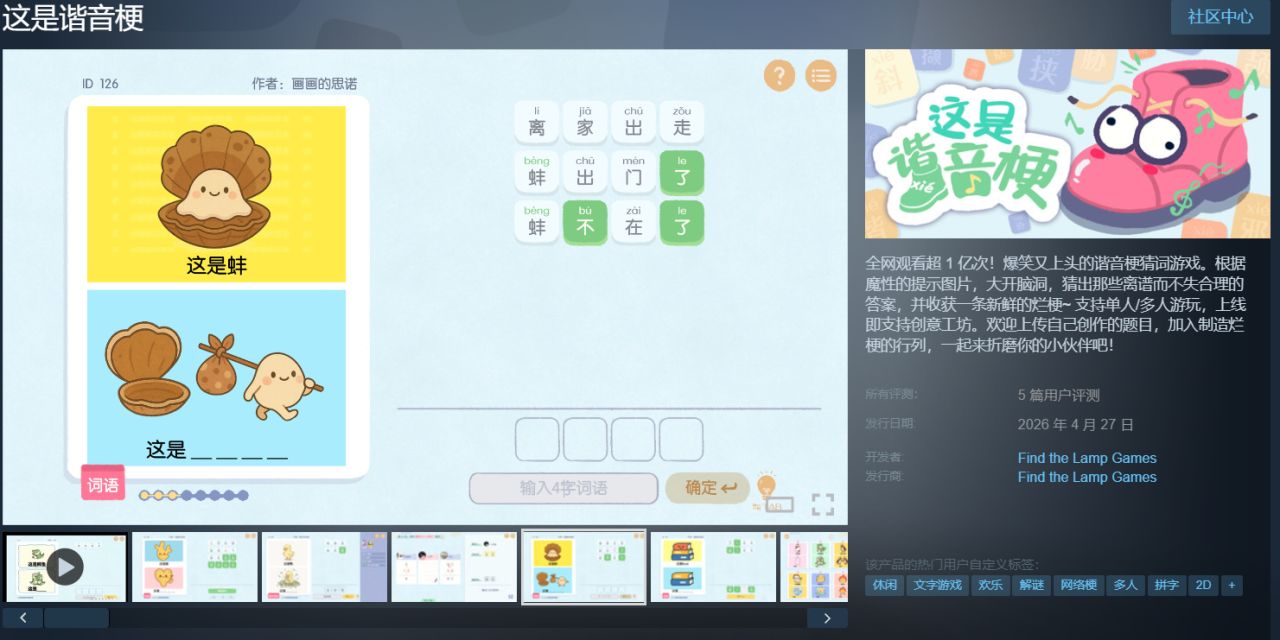 《这是谐音梗》现已在Steam正式推出,首发折后仅售8.88元,有捆绑包支持补齐,可额外叠加 10% 优惠。折扣持续至 5 月 11 日,感兴趣的话不要错过。