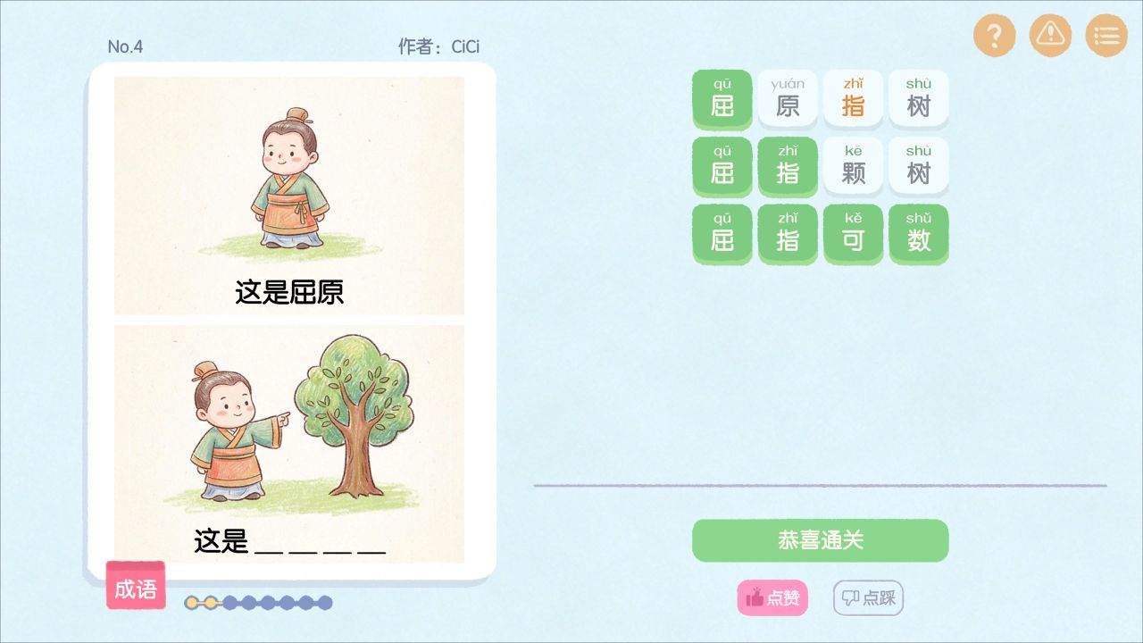 游戏玩法非常简单,你需要根据两张大开脑洞的提示图片,通过谐音联想猜出对应的词语或成语。每道题都有8次机会,每次猜测后还会通过颜色反馈字符、读音的位置是否正确,请尽情发挥你的脑洞!