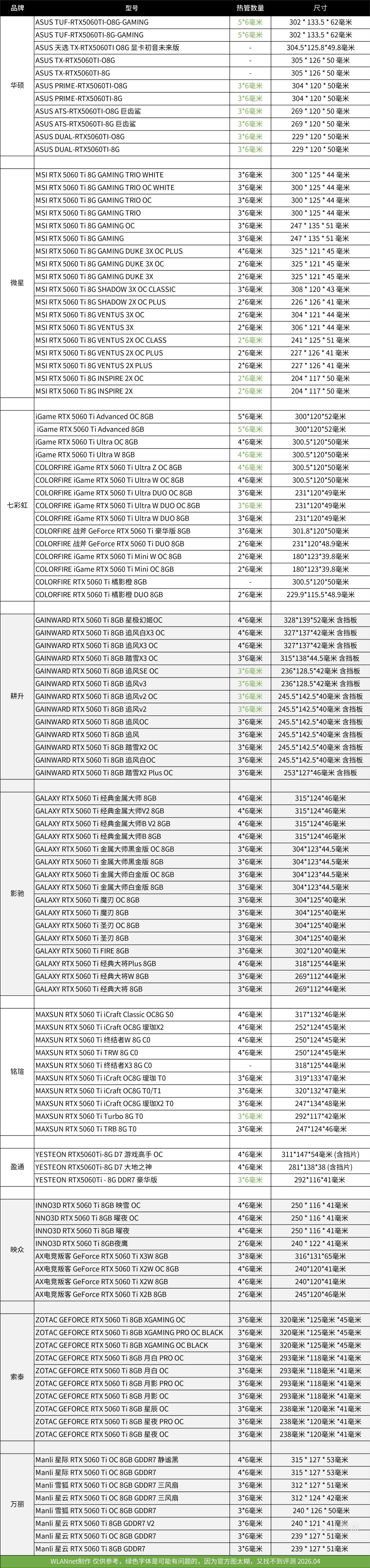 RTX5060Ti 8G,华硕11个,微星18个,七彩虹15个,耕升13个,影驰16个,只能说都挺离谱的,不知道出那么多型号干啥,尺寸还差不多。