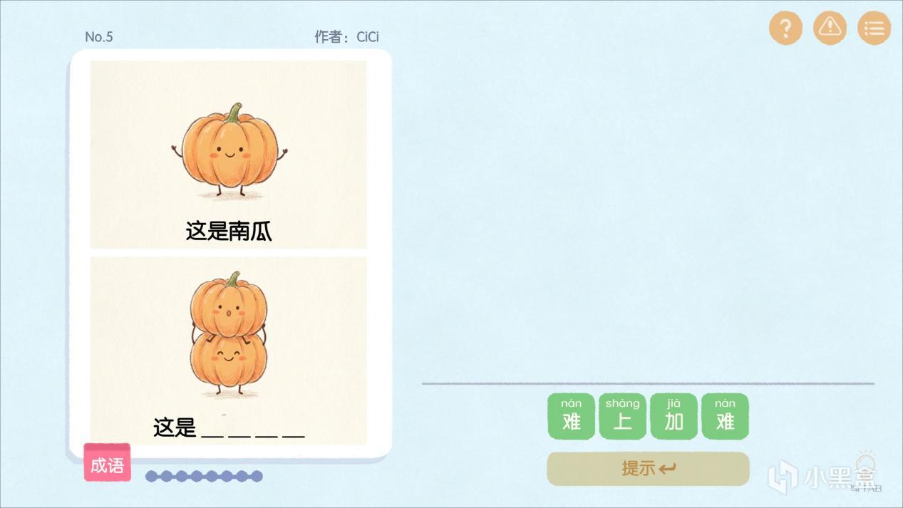 謎題的質量一般而言都挺高的,比如說這是個南瓜,南瓜上面還馱着一坨南瓜,那麼猜一個詞語吧?其實就是難上加難。這是梨,一堆梨在幾行音符上面,打一個感受?這就是離譜,這是雞,一個菜聞着的香味,說這個好香啊,那麼,猜一個歷史人物吧,這是蔡文姬。這是侄子,對你說這道題目並不會,打一個詞語,這就是直言不諱!