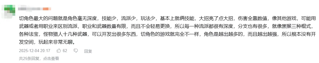 所以許多二遊都會提升閃避的收益,比如延長無敵幀,閃避後有額外的攻擊派生,以減少手機用戶的操作量。並且還會增加切人這一操作,其目的也是因爲商業化設計需要把單一的戰鬥機制切割成複數角色。於是切人閃打這套系統就出現在各家二遊的戰鬥裏面,但久而久之會讓戰鬥變得同質化,甚至枯燥。