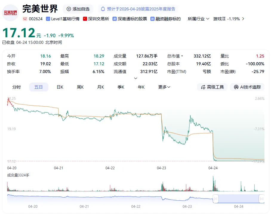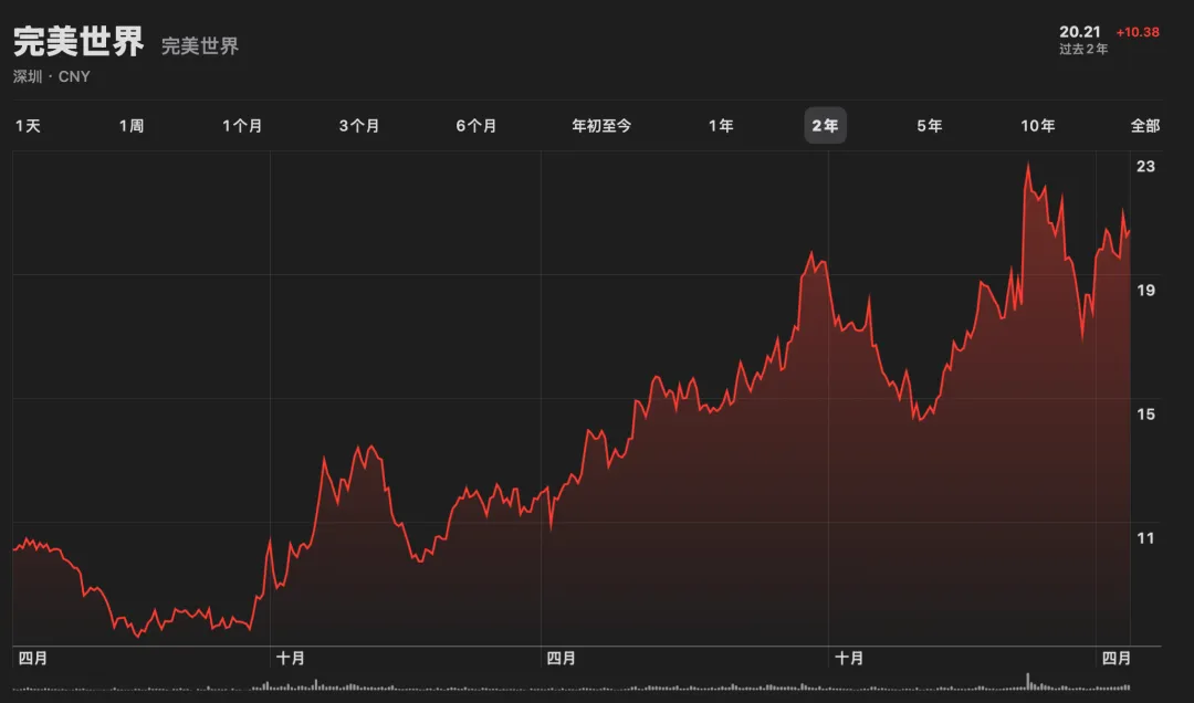 與其他很多二遊不一樣的是,《異環》背靠上市公司完美世界。數據顯示,在《異環》上線同期,完美世界股價出現一定波動,兩日累計跌幅約15.89%,市值變化約60億元。(股價波動受多重因素影響,本文不作直接因果判斷)。